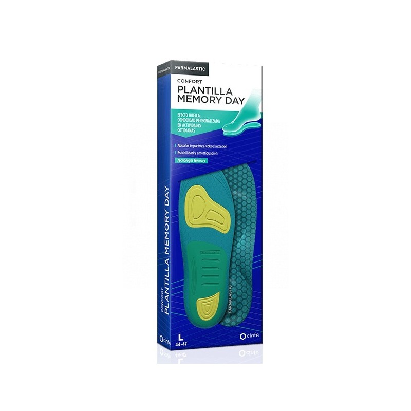 Las plantillas Memory Day de Farmalastic están desarrolladas con Tecnología MemoryFoam, que tiene memoria y recuerda la forma de la pisada, obteniendo un efecto huella. Están desarrolladas para absorber los impactos de forma eficaz y reducir la presión que los pies soportan a lo largo del día. Además, ayudan a proporcionar mayor estabilidad y soporte en el arco plantar y amortiguación en metatarso y talón. Pueden utilizarse con el calzado habitual o deportivo. Su sistema de tallaje y ajuste permiten una adecuada adaptación anatómica de cada talla al número de calzado. Pueden utilizarse con el calzado habitual o deportivo.